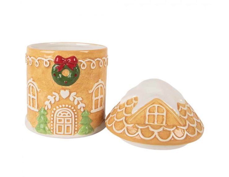 Pot en céramique en forme de maison pain d’épices avec détails colorés et couvercle assorti. Idéal pour les friandises de Noël.