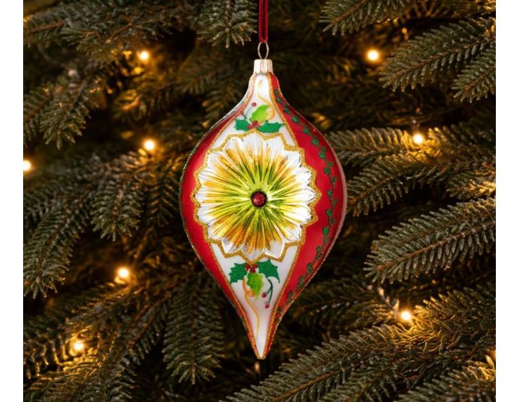 Une suspension de Noël en verre soufflé au charme vintage irrésistible. Sa forme en goutte effillée et son réflécteur, habillée de rouge, blanc et vert, avec ses médaillons chatoyants et ses motifs poinsettia, fait de cette pièce une suspension de Noël vintage d'exception.
