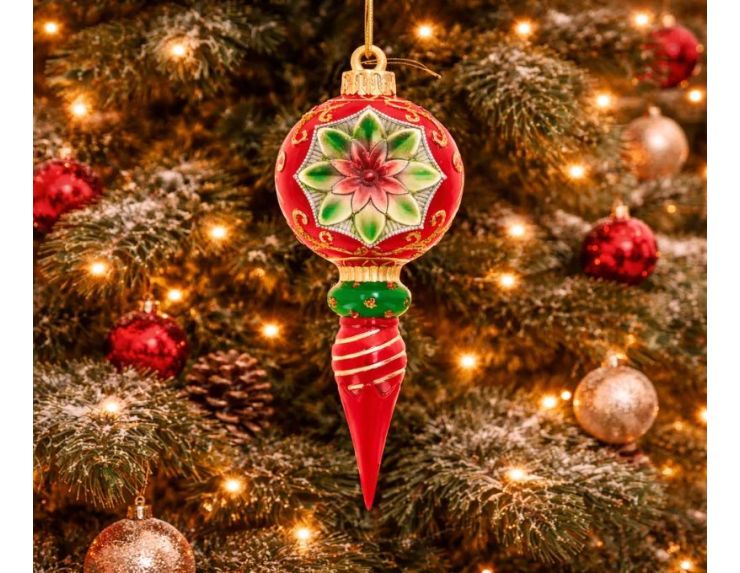 Cette suspension de Noël vintage est une pièce décorative raffinée au style rétro marqué. La boule rouge est ornée d'un grand motif de poinsettia vert et rouge en relief sur un médaillon argenté, entouré d'arabesques dorées sur le fond rouge. Un anneau vert strié à pois dorés fait la transition avec la pointe torsadée rouge à filets dorés spiralés qui confère à la pièce sa silhouette élégante.