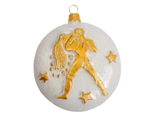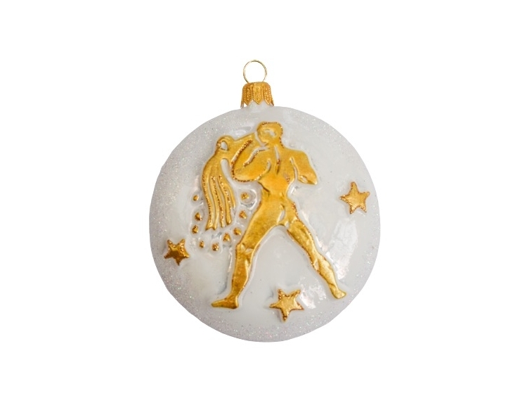 Suspension de Noël en verre soufflé et décorée à la main avec le signe du zodiac du verseau. Boule de Noël blanche avec le décor doré. Diamètre 8cm