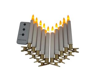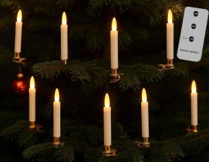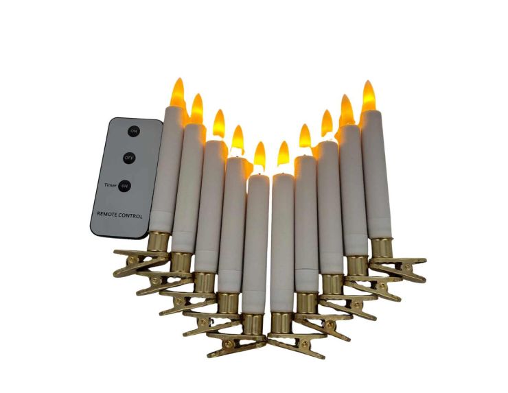 Ce lot de 10 bougies LED est idéal pour illuminer votre sapin en toute sécurité. Faciles à fixer grâce à leur pince dorée, elles apportent une lumière chaleureuse et festive. La télécommande fournie permet d’allumer, d’éteindre et de programmer un timer automatique de 6 heures. Fonctionnent avec 10 piles AAA (non fournies).
