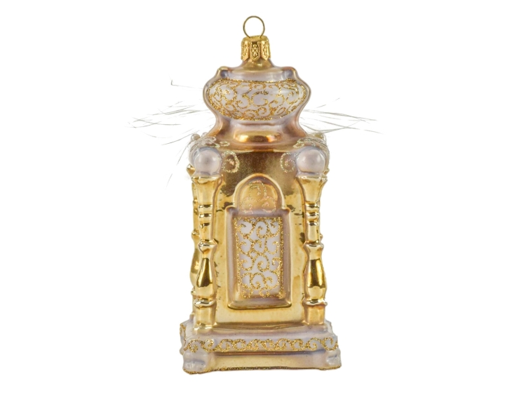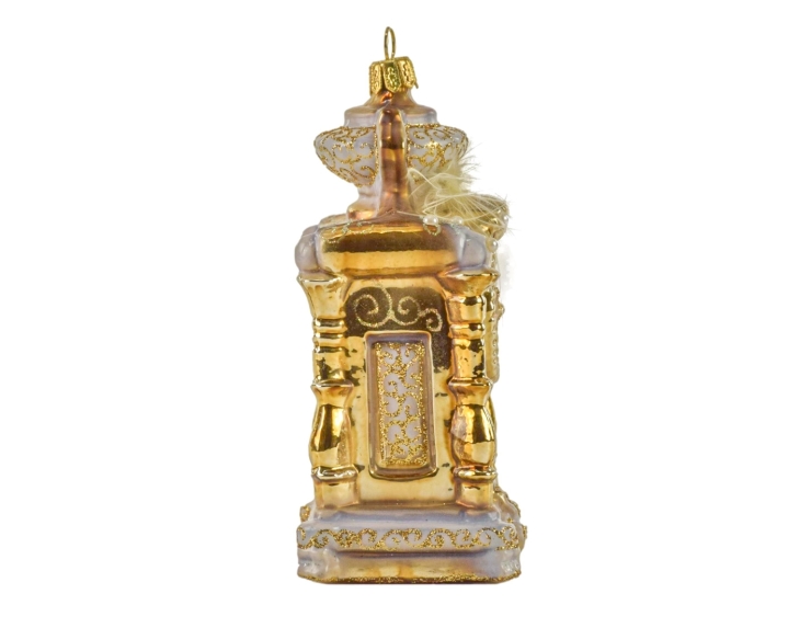 Boule de Noël originale en forme de clocher de style ancien dans les tons dorés et champagne surmontée de quelques plumes naturelles. Ce pendule en verre soufflé est décoré à la main avec précision.
