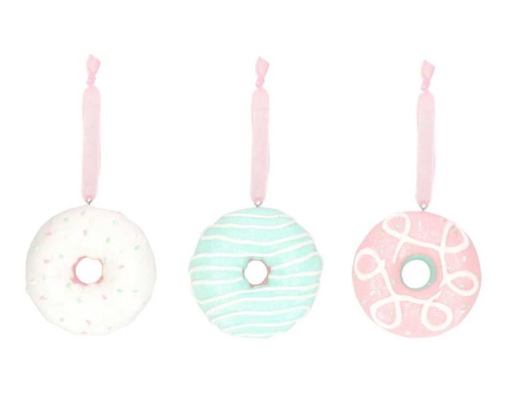Suspension de Noël en forme de donut blanc givré, décorée de mini éclats pastel et ruban rose pâle. Hauteur 8 cm, résine.