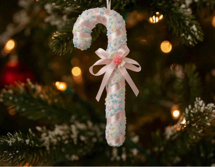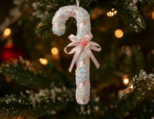 Suspension de Noël en forme de sucre d’orge pastel, ornée de perles multicolores et d’un ruban rose satiné. Hauteur 26 cm.