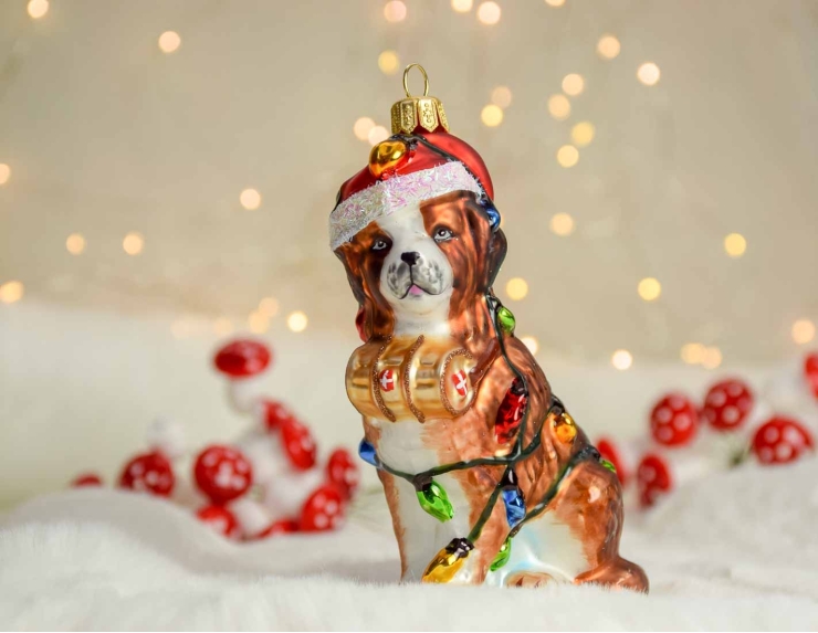 Boule de Noël originale en verre soufflé, chien Saint Bernard avec bonnet de Noël et guirlandes.