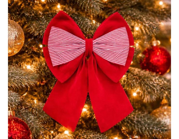 Ce très grand nœud de Noël décoratif est la version grand format du nœud rouge rayé de la collection. Ses larges pans en velours rouge mat et son centre en tissu rayé rouge et blanc créent une décoration imposante et festive. Les longues queues tombantes en velours rouge donnent au nœud une silhouette élégante et spectaculaire.