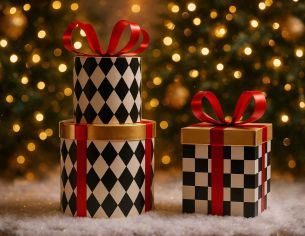 Cadeaux décoratifs en métal, motif damier noir avec ruban rouge brillant. Hauteur 40 cm.