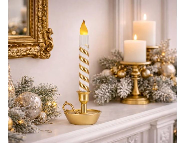 Cette bougie de Noël LED se distingue par sa forme torsadée blanc et or, élégante et lumineuse. Posée dans un bougeoir doré à anse sobre et raffiné, elle diffuse une lumière chaude grâce à sa flamme LED réaliste, sans danger et sans cire. Son style épuré blanc et or convient parfaitement à une décoration de Noël classique, luxe ou scandinave.