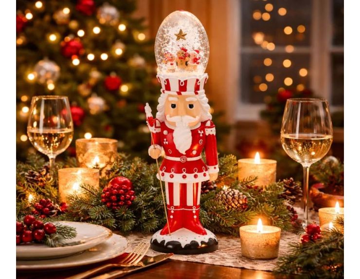 Figurine de Noël casse-noisette rouge et blanc en polyrésine, avec boule à neige tournante sur la tête contenant des personnages pain d'épices et une étoile dorée, et éclairage LED intégré. Fonctionne sur piles.