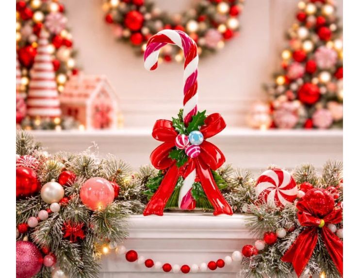 Avec ses 45 cm de hauteur, ce sucre d'orge décoratif s'impose facilement sur une table, un buffet, une cheminée ou dans une entrée. Sa palette rose, rouge et vert la distingue des décors classiques pour une ambiance candy et festive.
