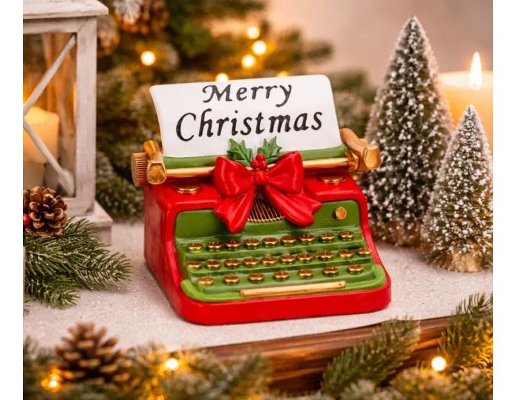 Cette décoration de Noël en polyrésine représente une machine à écrire rétro rouge vif au clavier vert et touches dorées. Une feuille blanche glissée dans le rouleau affiche en lettres cursives "Merry Christmas". Un grand nœud rouge et une branche de houx ornent le rouleau, ajoutant une touche festive et poétique à la composition.