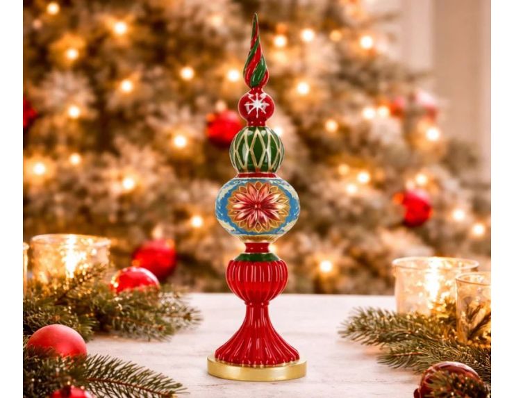 Ce totem de Noël décoratif à poser est une pièce verticale élégante et richement ornementée. Sur un socle rouge à cannelures reposant sur une base dorée, deux boules empilées aux motifs distincts composent la colonne centrale : la boule du bas affiche un grand motif floral de poinsettia rose et or sur fond bleu ciel, la boule du haut présente un réseau de losanges verts et blancs. Une petite boule rouge à étoile blanche fait la transition avant la flèche torsadée rouge et verte qui couronne l'ensemble.