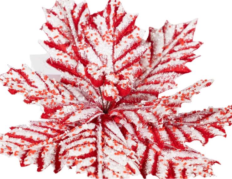Poinsettia frosty candy de 27 x 45 cm aux feuilles rouges et blanches, recouvert d’un effet givré.