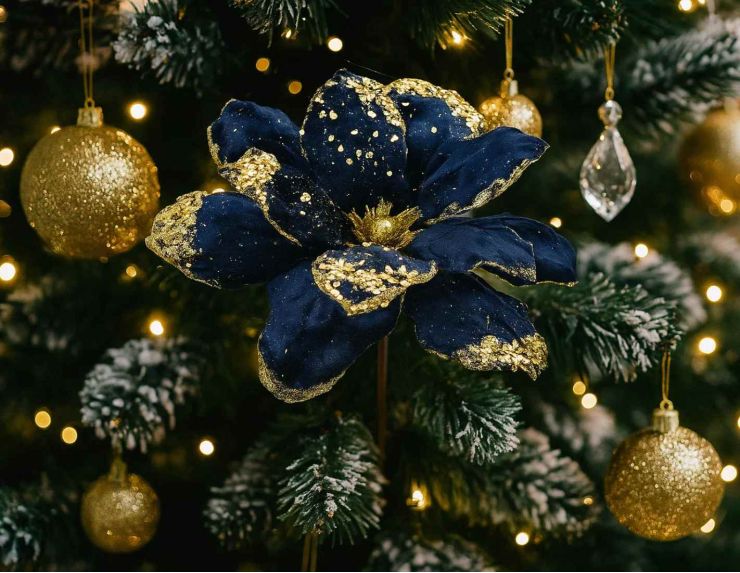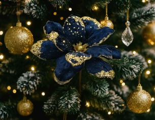 Ajoutez une touche d’élégance et de magie à vos décorations de Noël avec cette somptueuse fleur bleu marine ornée de paillettes et sequins dorés. Son velours profond contraste magnifiquement avec les éclats dorés, pour une décoration raffinée et lumineuse.