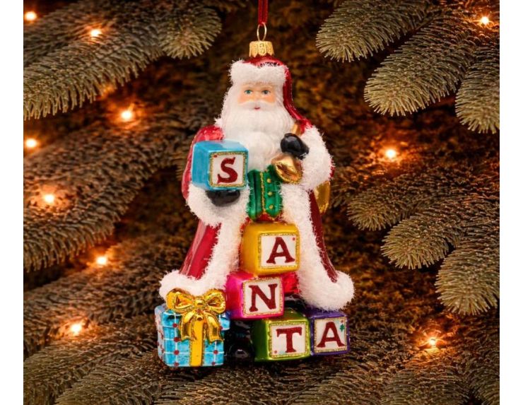 Cette suspension de Noël en verre soufflé représente un Père Noël jovial, vêtu de sa robe rouge bordée de fourrure blanche, tenant fièrement une pile de cubes multicolores brillants qui épellent le mot SANTA. Les cubes bleu, jaune, rose et vert aux lettres rouges pailletées sont peints à la main avec un souci du détail remarquable. À ses pieds, un cadeau turquoise à nœud doré complète la scène avec gaieté.