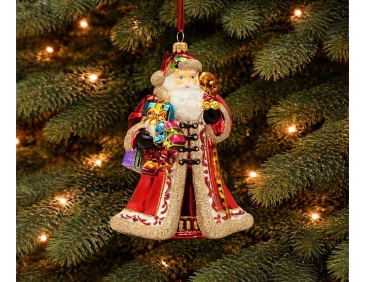 Suspension de Noël en verre soufflé représentant un Père Noël vintage dans une longue robe rouge brodée d'or et de paillettes, portant une pile de cadeaux colorés et une clochette dorée. Décor d'antan aux couleurs profondes, finition brillante et détails peints à la main : une suspension Père Noël rétro et collector d'une élégance intemporelle.