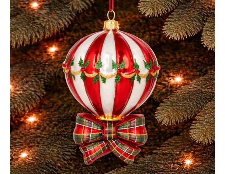 À la base, un grand nœud tartan rouge et vert aux reflets dorés complète la suspension avec élégance. Une suspension de Noël montgolfière en verre soufflé collector, idéale pour un sapin de Noël traditionnel haut de gamme.