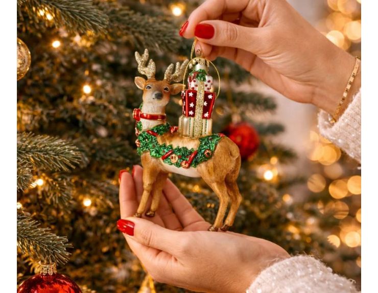 Cette suspension de Noël en verre représente un renne brun élancé aux bois dorés pailletés, un collier rouge autour du cou. Une guirlande de feuilles vertes ornée de petites boules dorées et de baies rouges ceint son corps. Sur son dos, une pile de cadeaux multicolores — rouge à flocons, blanc à rayures — est retenue par un anneau doré.