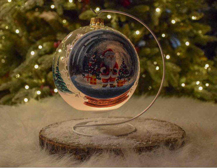 Créez une ambiance magique avec cette superbe boule de Noël photophore en verre soufflé, délicatement peinte à la main. D’un diamètre de 15 cm, elle représente un adorable Père Noël entouré de sapins décorés et de cadeaux qui est dans une boule à neige, capturant toute la féerie des fêtes. Grâce à une ouverture à l'arrière, vous pouvez y glisser une bougie chauffe-plat pour illuminer doucement le décor, diffusant une lumière chaleureuse et festive. Ses détails minutieux et ses couleurs vives font de cette boule une pièce unique pour sublimer votre décoration de Noël. Le support blanc inclus permet de la suspendre ou de la poser avec élégance, créant une atmosphère cosy dans votre intérieur.