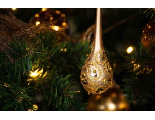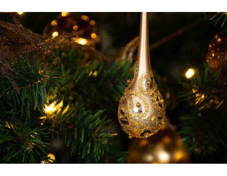 Goutte de Noël en verre soufflé de couleur bronze scintillant avec le bas de la goutte décorée à la main de dessin aux motifs cachemire à paillettes dorées et surplombée de petites billes brunes.