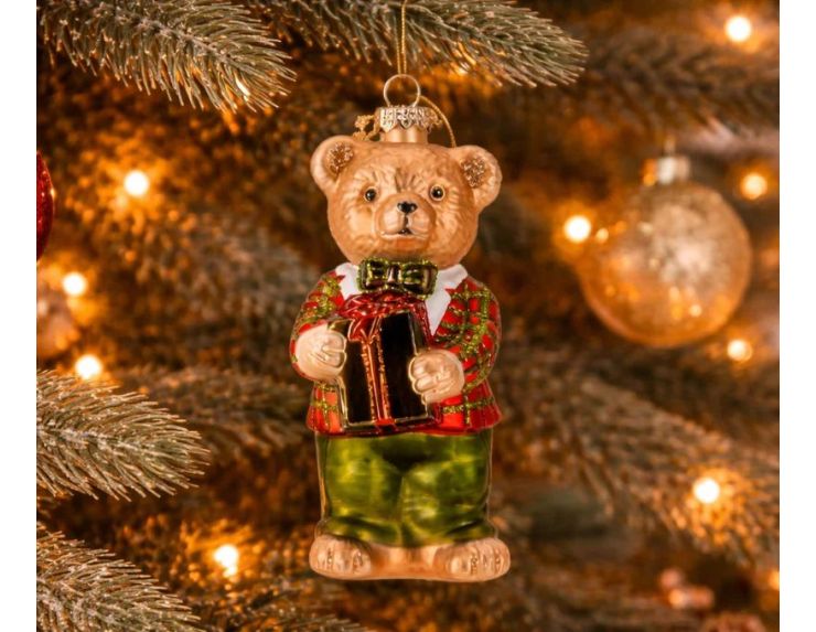 Cette suspension de Noël en verre représente un adorable ourson brun aux oreilles dorées, vêtu d'une veste tartan rouge et vert à reflets pailletés et d'un pantalon vert brillant. Il tient contre lui un petit cadeau noir orné d'un ruban rouge. Son expression sérieuse et attachante lui donne un charme tendre et original.