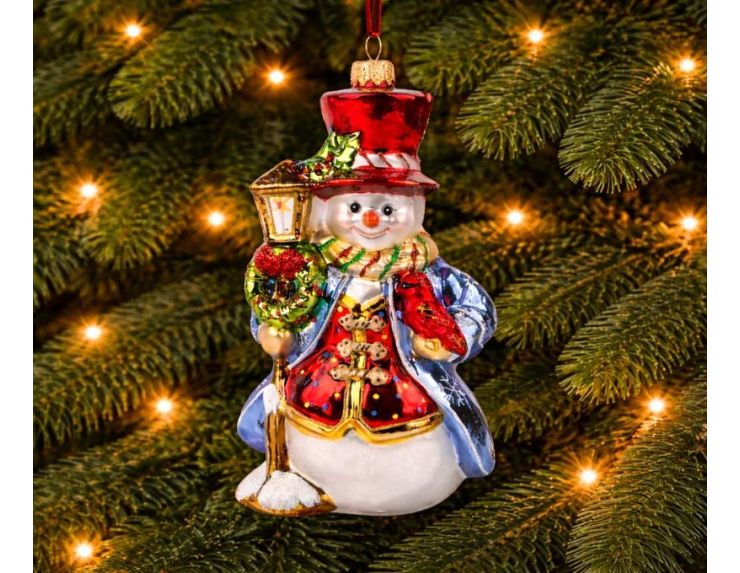 Cette suspension de Noël en verre soufflé représente un bonhomme de neige d'une élégance et d'une finesse remarquables. Coiffé d'un chapeau rouge orné de houx, il tient dans une main une lanterne dorée et une couronne de houx vert. Son manteau bleu aux flocons blancs peints, son gilet rouge brodé de boutons dorés et son écharpe rayée multicolore composent une tenue festive et détaillée peinte à la main.
