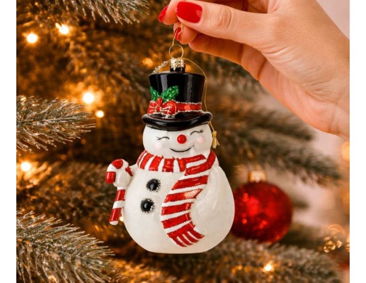 Cette suspension de Noël en verre représente un bonhomme de neige blanc joufflu et souriant, au nez rouge et aux yeux fermés bienveillants. Il porte un chapeau haut-de-forme noir orné d'une branche de houx vert et rouge, une écharpe rayée rouge à reflets pailletés et tient un sucre d'orge rouge et blanc dans la main. Ses deux boutons noirs brillants complètent le détail soigné de la pièce.