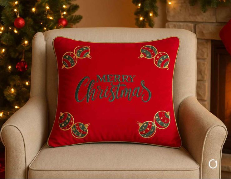 Apportez une touche festive et originale à votre salon avec ce coussin rouge en velours orné de boules de Noël façon cirque. Une pièce unique pour sublimer votre décoration de fêtes.