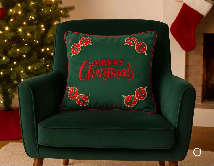 Coussin de Noël vert en velours avec inscription "Merry Christmas" et motifs de boules façon cirque. Dimensions : 47 x 47 cm. Intérieur inclus.