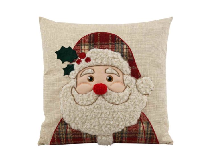 Coussin carré 45 x 45 cm en tissu beige avec motif brodé du visage du Père Noël, bonnet en tartan rouge, intérieur inclus.