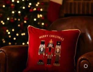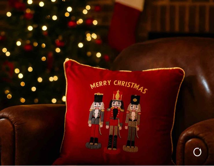 Ajoutez une touche chic et traditionnelle à votre déco avec ce coussin en velours rouge orné de magnifiques casse-noisettes brodés. Parfait pour un salon festif et chaleureux.