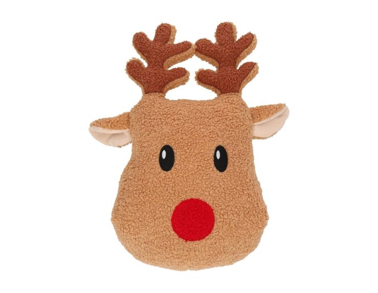 Coussin de Noël en forme de tête de renne, en tissu bouclette avec bois doux et nez rouge. Hauteur : 35 cm.