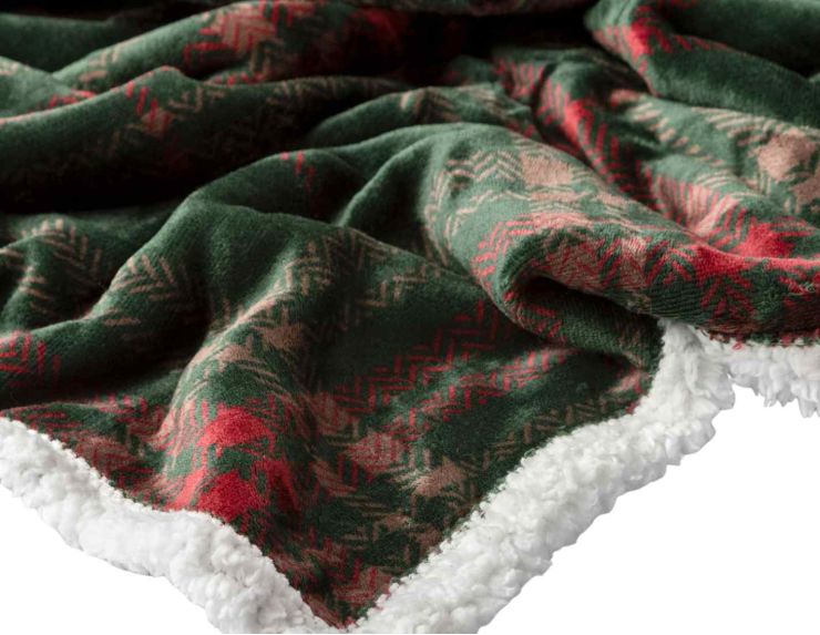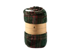 Plaid tartan vert rouge avec intérieur sherpa blanc, ultra doux et chaud, dimensions 150x200 cm.