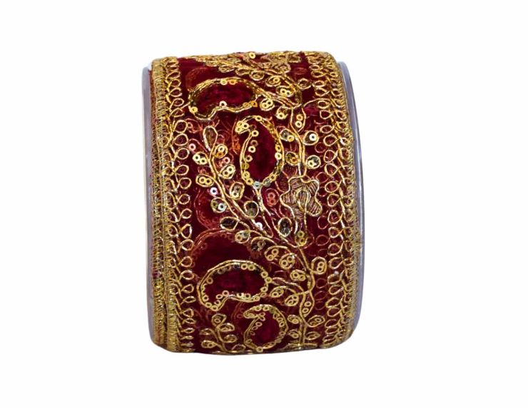 Ruban de Noël rouge bordeaux et or brodé avec sequins dorés. Largeur 8 cm, longueur 4,5 m. Idéal pour sapins, guirlandes ou emballages cadeaux.