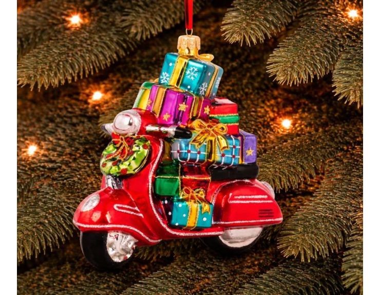 Suspension de Noël en verre soufflé en forme de scooter rouge chargé d'une pile de cadeaux multicolores peints à la main. Couronne de houx sur le guidon et nœuds dorés : une pièce originale et collector pour un sapin festif et décalé.